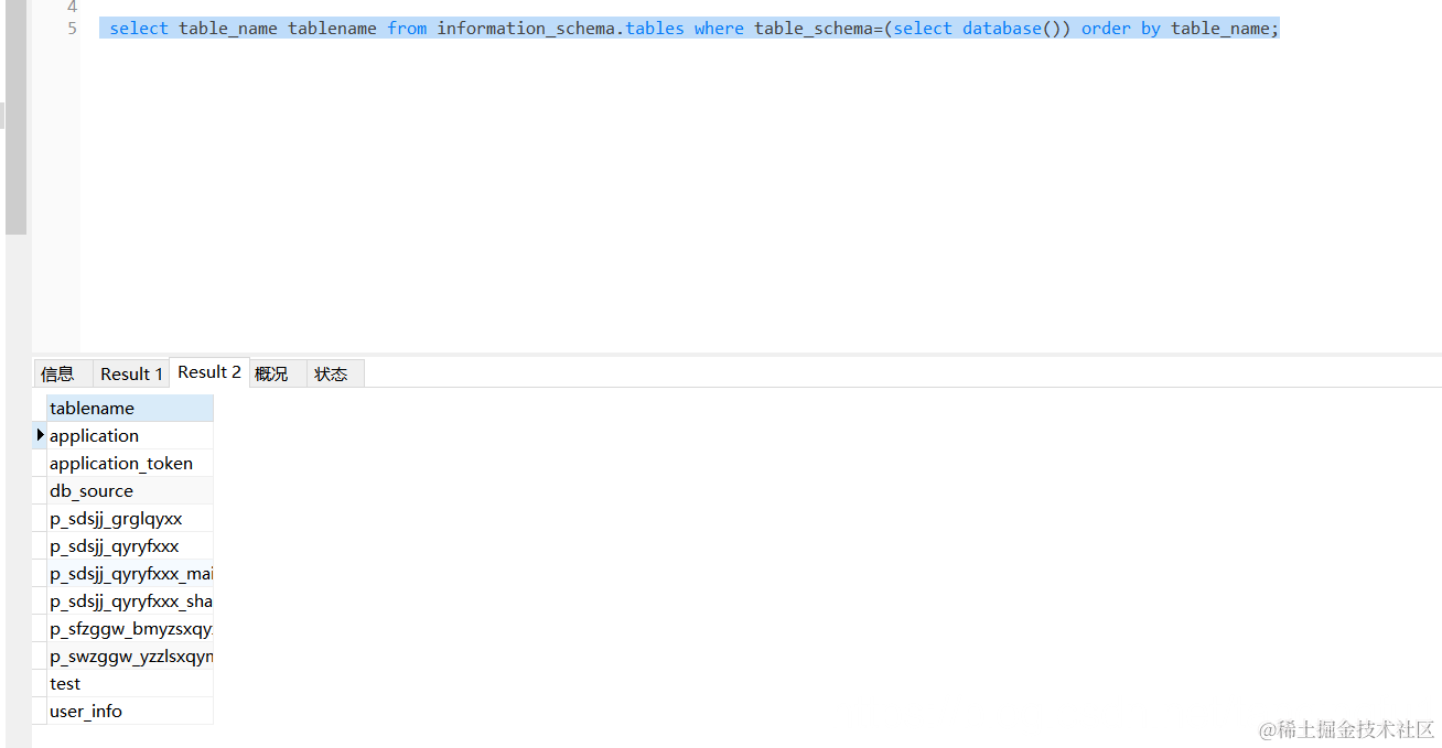 select table_name tablename from information_schema.tables where table_schema=(select database()) order by table_name;