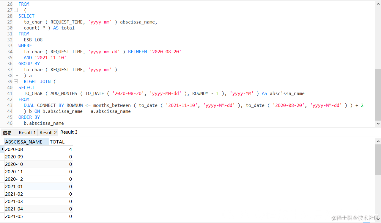 DUAL CONNECT BY ROWNUM <= months_between ( to_date ( '2021-11-10', 'yyyy-MM-dd' ), to_date ( '2020-08-20', 'yyyy-MM-dd' ) ) + 2