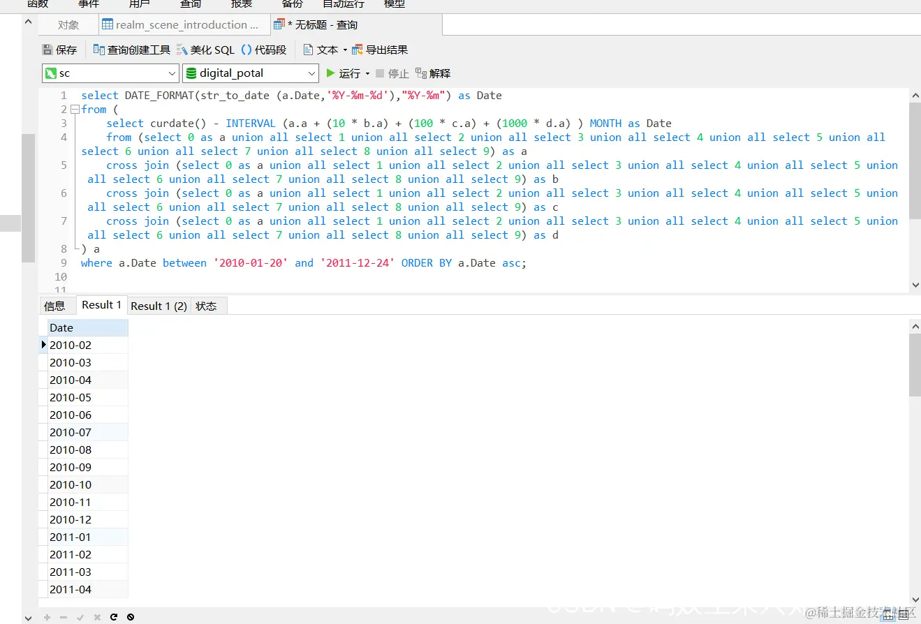 3、创建为视图之后,可以通过视图查询时间区间列表日期