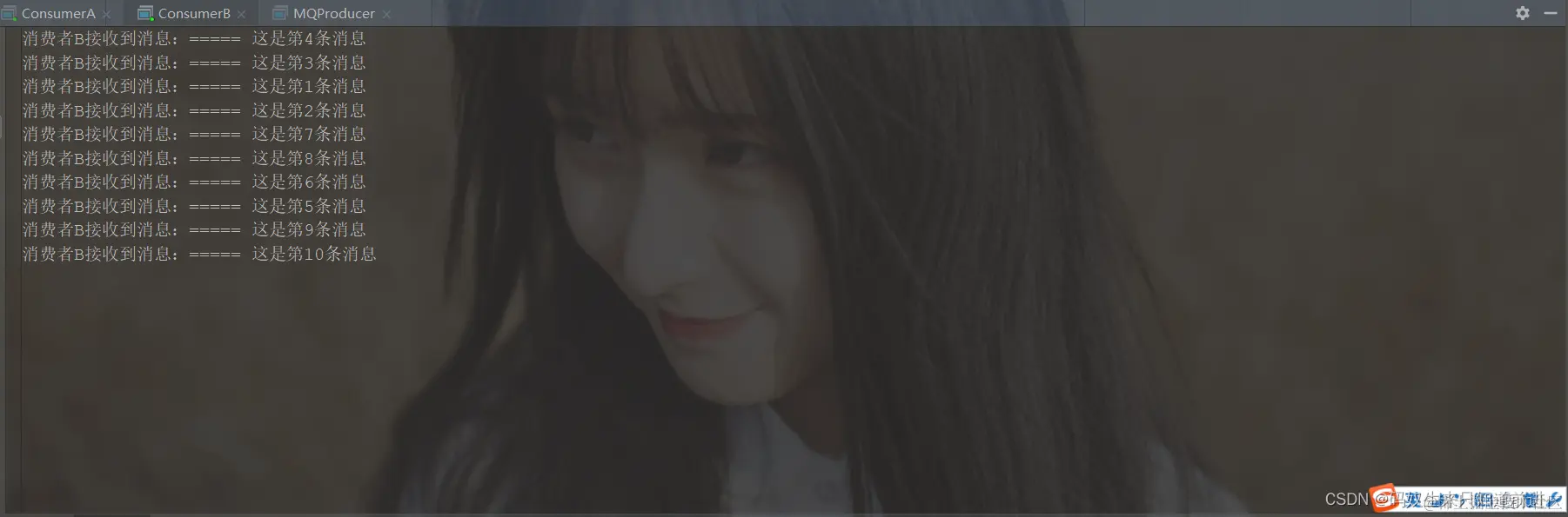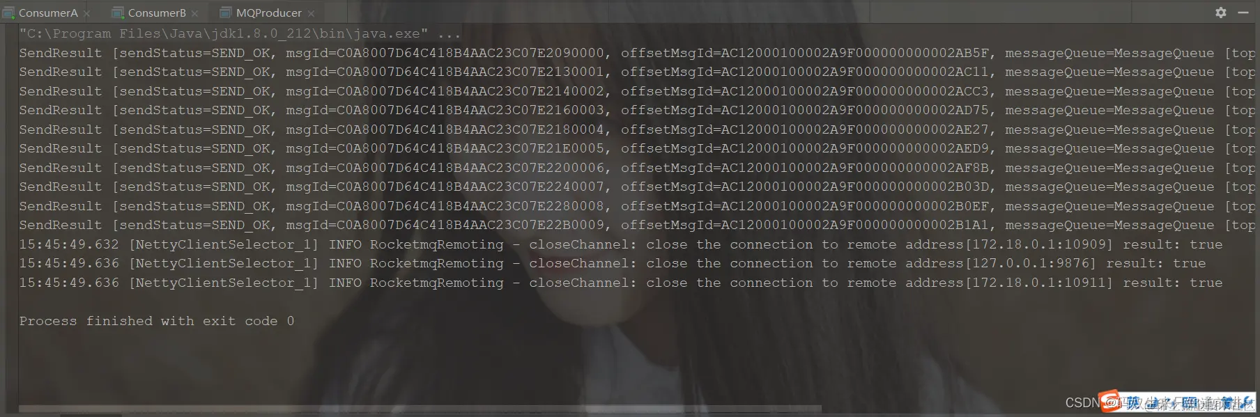 可以看到生产者发送了10条消息,ConsumerA与ConsumerB属于同一个消费者组,广播模式下每个消费者都会全量消费所有消息 。