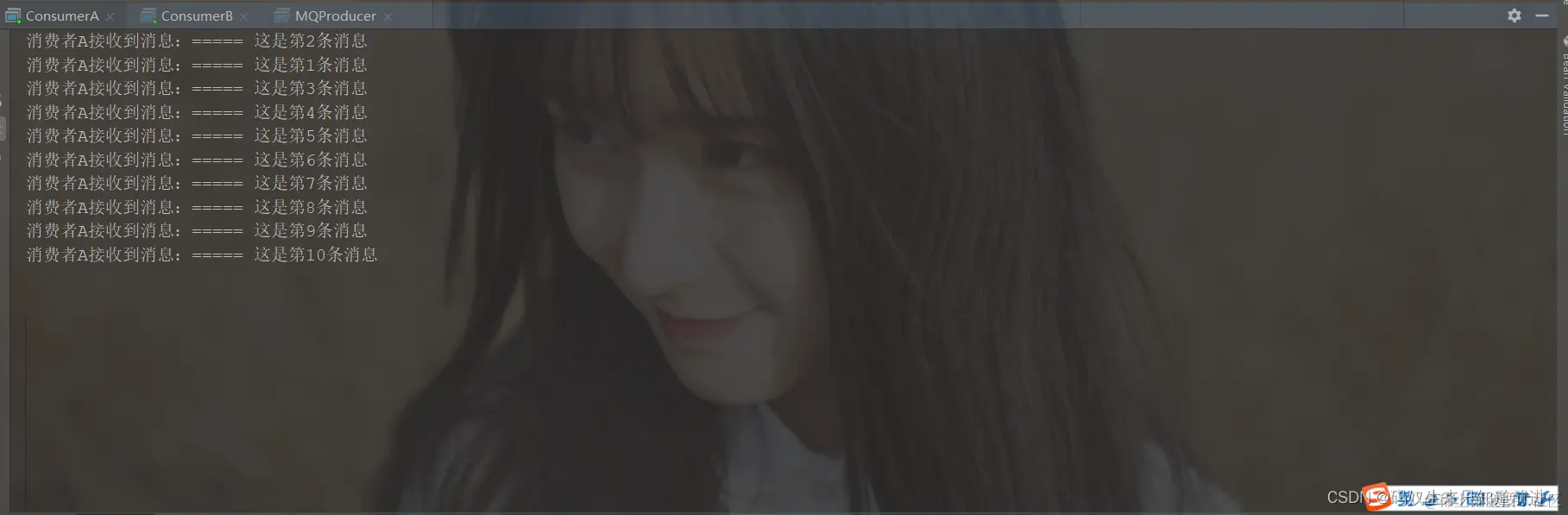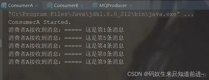 System.out.println("消费者A接收到消息:" + "===== " + msgBody);