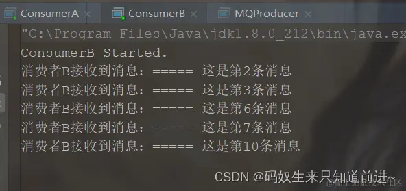 可以看到, 生产者发送了10条消息,ConsumerA与ConsumerB属于同一个消费者组,集群消费模式下每个消费者摊分消费所有消息。注意,两个消费者的ConsumerGroup组名需要一致,才算是同一个消费者组。