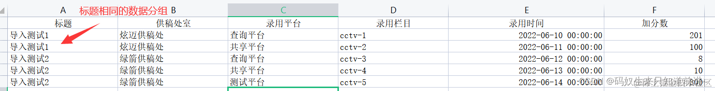 private final static String data = "[{\"contributorsOffice\":\"炫迈供稿处\",\"employedColumn\":\"cctv-1\",\"employedTime\":1654790400000,\"platformManagementName\":\"查询平台\",\"score\":201,\"title\":\"导入测试1\"},{\"contributorsOffice\":\"炫迈供稿处\",\"employedColumn\":\"cctv-2\",\"employedTime\":1654876800000,\"platformManagementName\":\"共享平台\",\"score\":100,\"title\":\"导入测试1\"},{\"contributorsOffice\":\"绿箭供稿处\",\"employedColumn\":\"cctv-3\",\"employedTime\":1654963200000,\"platformManagementName\":\"查询平台\",\"score\":8,\"title\":\"导入测试2\"},{\"contributorsOffice\":\"绿箭供稿处\",\"employedColumn\":\"cctv-4\",\"employedTime\":1655049600000,\"platformManagementName\":\"共享平台\",\"score\":10,\"title\":\"导入测试2\"},{\"contributorsOffice\":\"绿箭供稿处\",\"employedColumn\":\"cctv-5\",\"employedTime\":1655136000000,\"platformManagementName\":\"测试平台\",\"score\":300,\"title\":\"导入测试2\"}]";