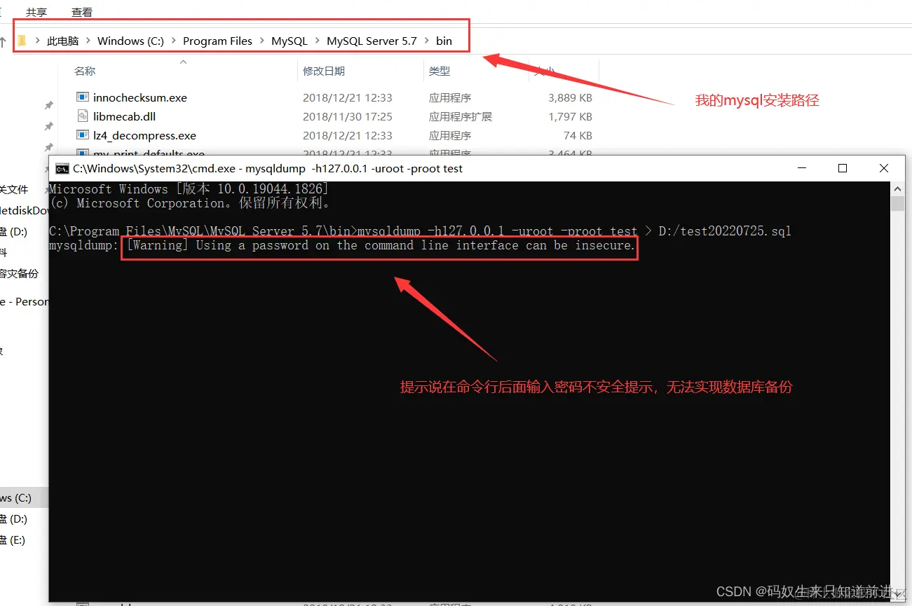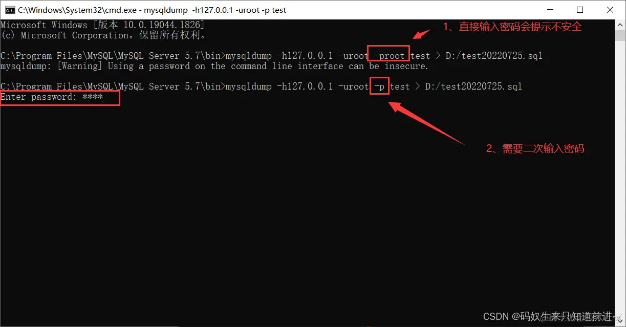 mysqldump -h127.0.0.1 -uroot -proot test > D:/test20220725.sql