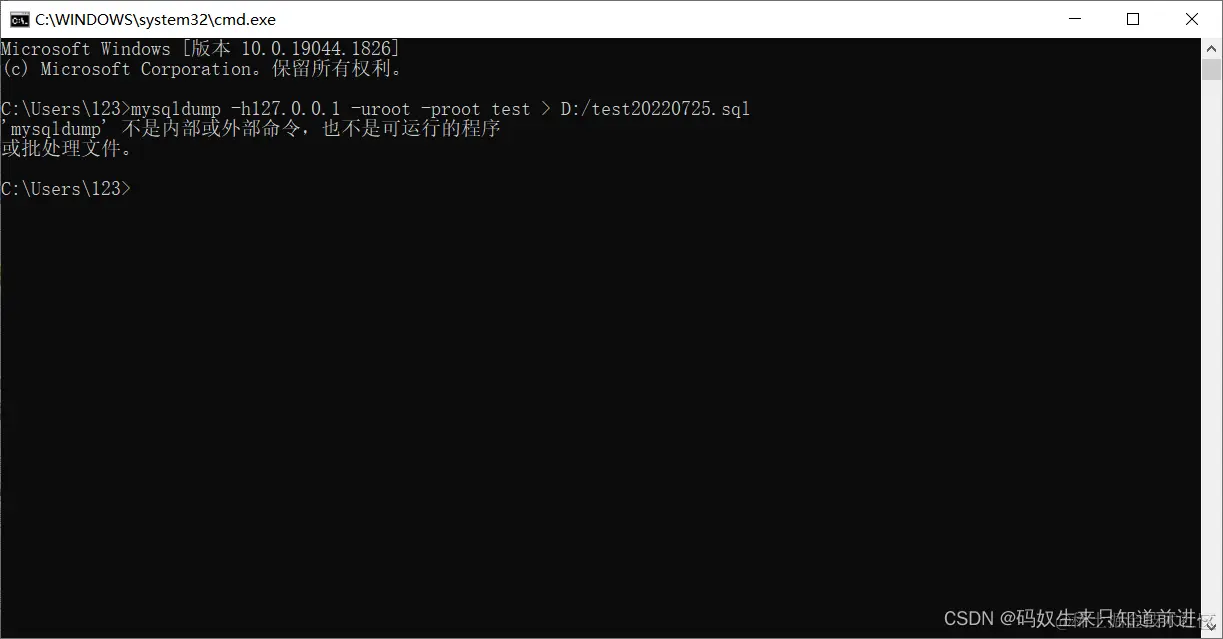 mysqldump -h127.0.0.1 -uroot -proot --result-file=D:/123/test_202207251521.sql --default-character-set=utf8 test