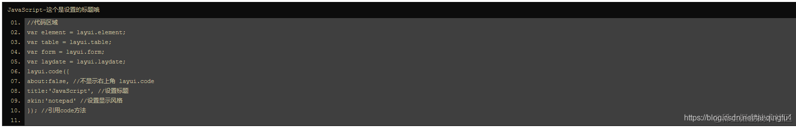 很多时候我们需要展示一些代码在页面上,这个时候就可以使用到layui.code方法来快速的实现