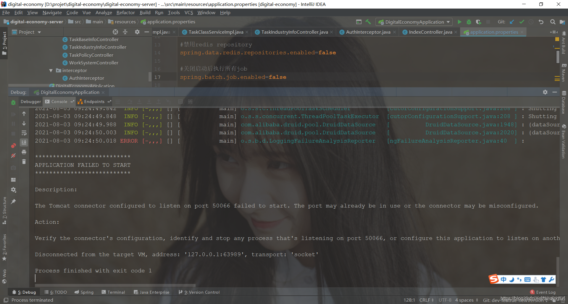 idea启动项目端口被占用 码奴生来只知道前进 2022-07-29 147 阅读1分钟 看启动的错误代码提示是端口50066被占用了,这个时候我们就需要替换端口或者杀掉这个端口 1、查询对应的端口进程 首先通过cmd命令进入命令窗口 2、进入到命令窗口之后使用查看端口进程的命令查询:netstat -aon|findstr 50066 3、使用命令杀掉对应端口的进程:taskkill -f -pid 16560 然后在重新启动项目就好了