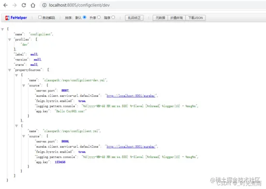刚才我们注意到,我们之间访问如:http://localhost:8005/encrypt/status、http://localhost:8081/encrypt 等状态,加密、解密接口是可以之间访问的。甚至我们可以之间访问配置中心获取配置文件的接口地址:http://localhost:8005/configclient/dev: