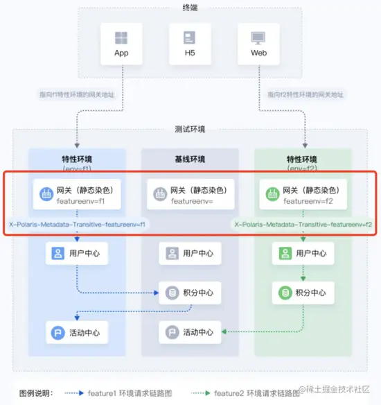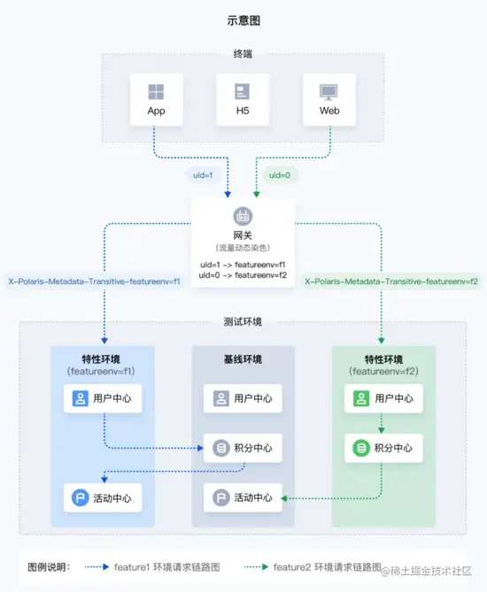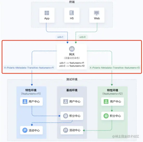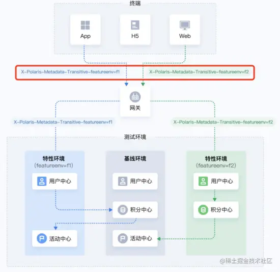 测试环境路由的样例实现以下图为例,一共有两个测试环境以及一个基线环境。流量从端到端会依次经过以下组件:App -> 网关 -> 用户中心 -> 积分中心 -> 活动中心。