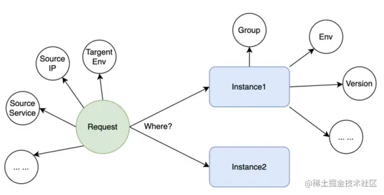 在流量的微观世界里,统一通过标签(属性)来标识一个实体,例如请求有来源调用服务、目标环境标签等,服务实例则有版本号、实例分组、环境分组等标签。服务路由则是将满足标签匹配条件的请求转发到满足匹配条件的服务实例。所以服务路由的模型可拆解出如下的的专业术语: