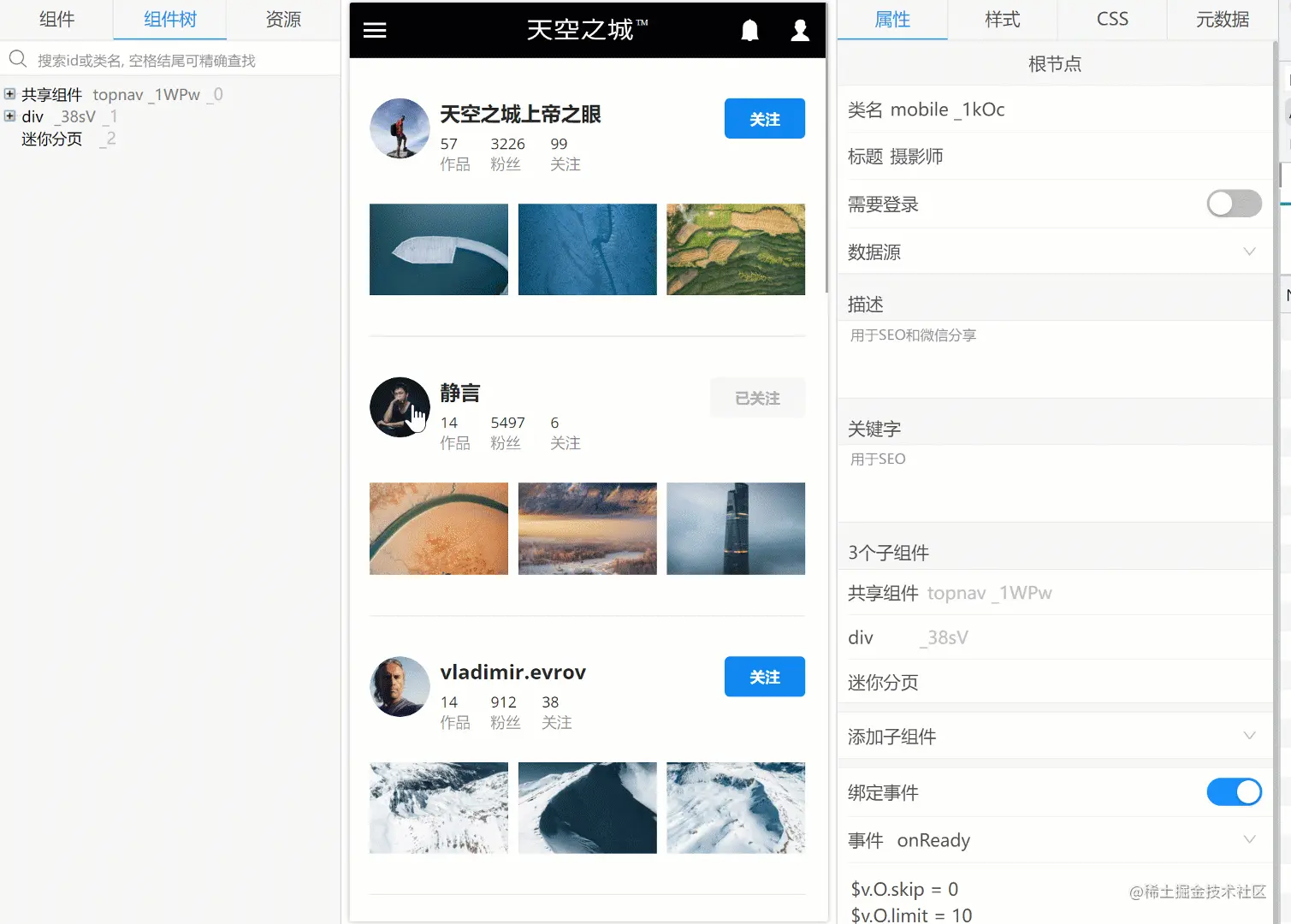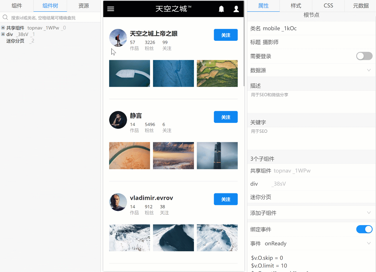 插件是开箱即用的,只需要配置一下【路径】即可(填users),但这里分页除了自动读取用户(摄影师)数据外,还得进一步读取他们的摄影作品,所以在【onPageChanged】里要写读取作品列表的表达式。 -