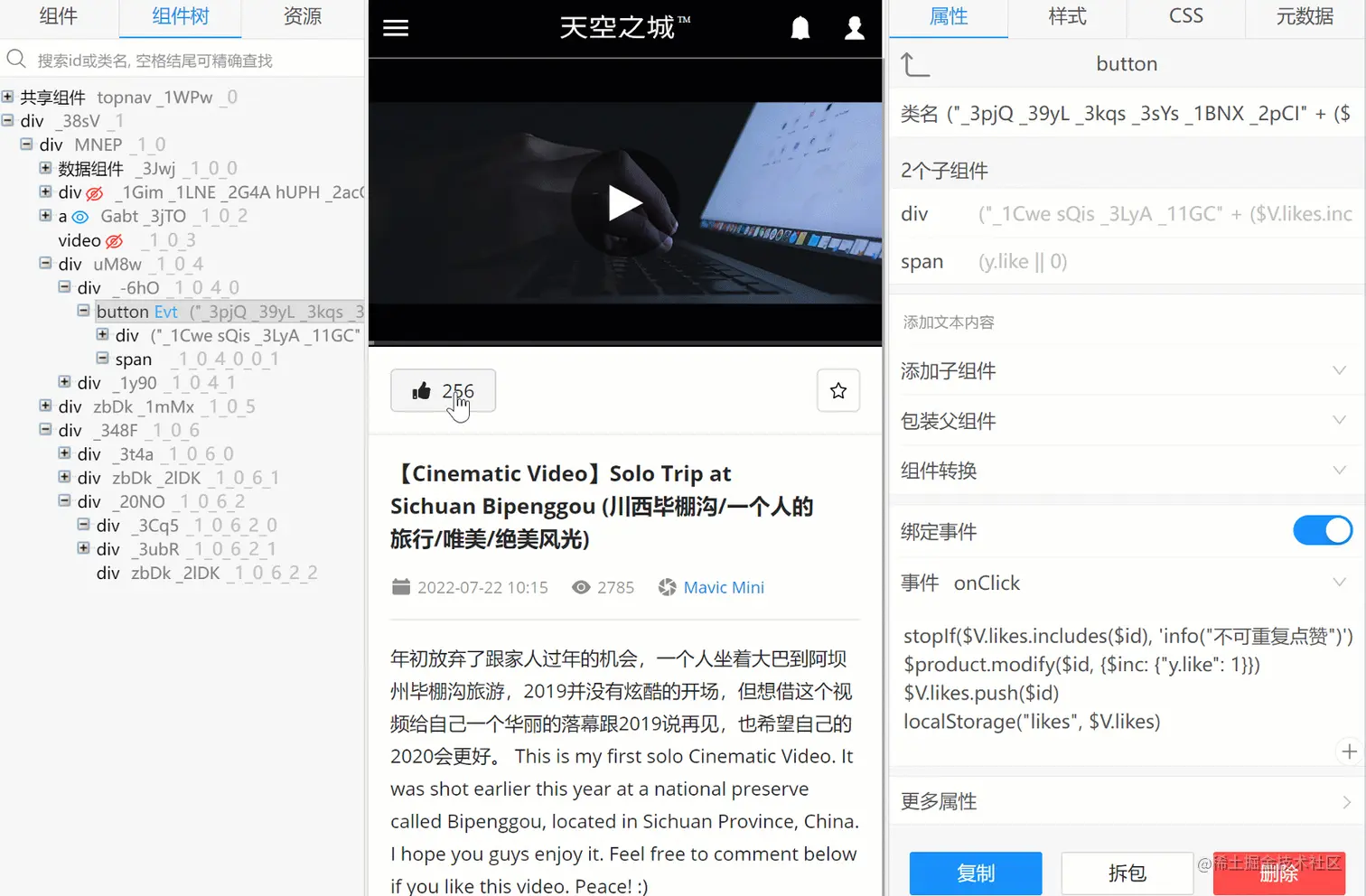 另外点赞按钮要根据当前用户是否已经当前作品点过赞而改变样式,用到了动态类名:$V.likes.includes($id) ? " SOTD" : ""