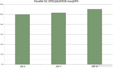 Parallel GC的吞吐量增长。关于Parallel GC,图3给出了从JDK 8到JDK 18中maxjOPS的改进结果,堆的设置与之前的测试相同。同样,即使是Parallel GC,仅仅替换JVM也可以获得大约2%的吞吐量提升,最好情况下甚至能提升10%。提升比G1小,因为Parallel GC原本的起点就很高,因此增长较小。