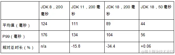 我扩展了试验范围,增加了JDK 18下暂停时长设置为50毫秒,因为之前随意设置的-XX:MaxGCPauseMillis为200毫秒还是太长了。平均来看,G1达到了暂停时长的目标,P99垃圾回收暂停时长为56毫秒(见表3)。总体上,与JDK 8相比,暂停花费的总时间并没有增加太多(0.06%)。