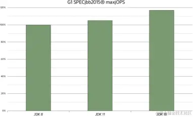 图2展示了G1在组合模式下在一个16GB的Java堆上的maxjOPS结果,图中给出了JDK 8、JDK 11和JDK 18的对比。可以看出,JDK版本越新,吞吐量得分就越高。JDK 11比JDK 8高出了约5%,而JDK 18高出了约18%。简单来说,JDK版本越新,用于应用程序实际工作的资源就越多。