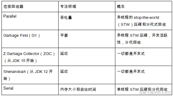 OpenJDK提供了五种GC,分别专注于不同的性能度量。表1列出了GC的名称、专注领域,以及实现特定特性所使用的核心概念。