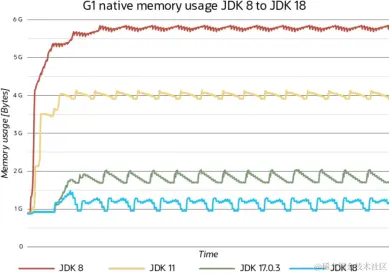 在JDK 8中,经过了短暂的预热阶段后,G1原生内存使用稳定在5.8GB左右。JDK 11在此基础上,将原生内存代销降低到了4GB左右;JDK 17进一步改进到1.8GB,而JDK 18稳定在1.25GB。额外内存使用量从JDK时代的30%堆大小降低到了JDK 18时代的6%左右。