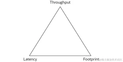 这些关系通常可以画成一个三角形,如图1所示。每个垃圾回收算法占据三角形的一个角。