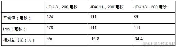 JDK 8的暂停平均时长为124毫秒,P99为176毫秒。JDK 11将平均时长提高到了111毫秒,P99提高到了134毫秒,总体减少了15.8%的暂停时长。JDK 18再次显著改善,平均时长减少到了89毫秒,P99减小到了104毫秒,总时长减小了34.4%。