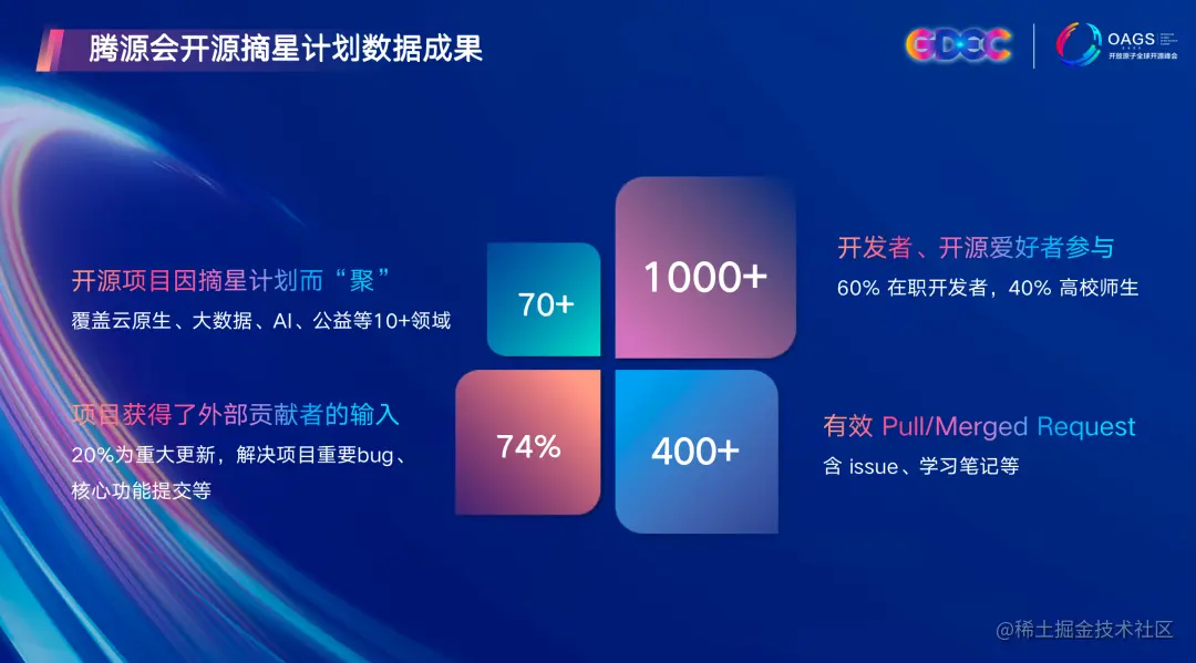 在实际开展过程中,我们也收到了不少项目参与方的反馈,例如有的项目说 2 天就增长了 10 多位外部贡献者,有的项目说加入了开源摘星计划之后,社区里涌入了比之前多 1 倍的 PR 提交。