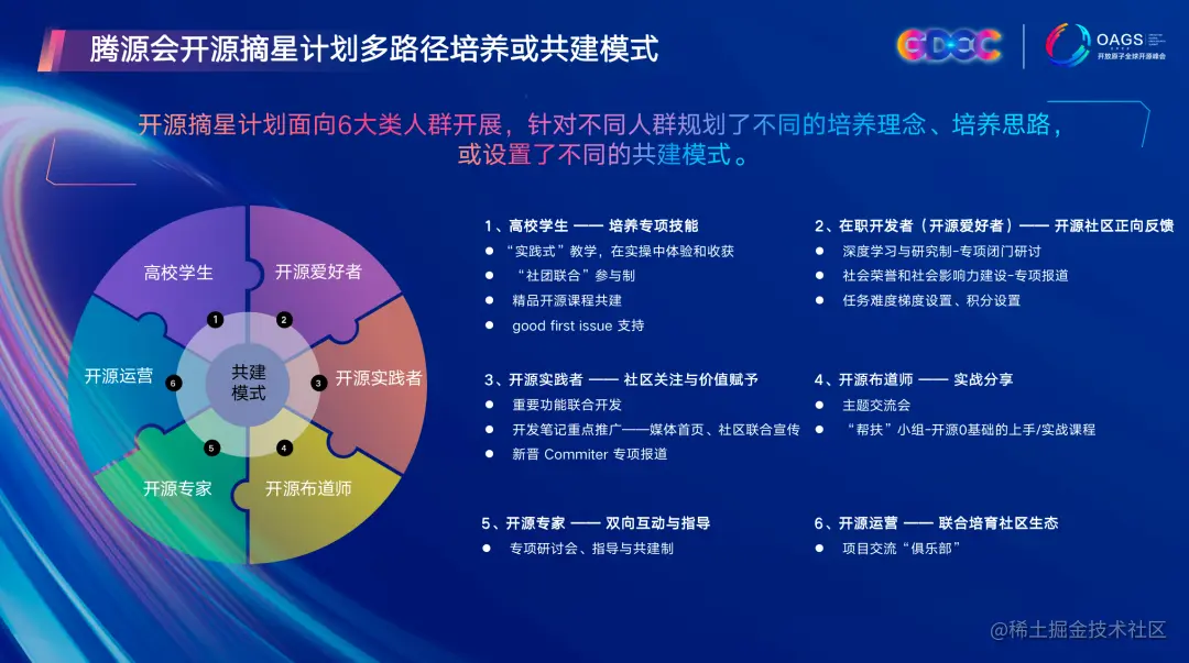 在上面这张图中,可以看到开源摘星计划针对高校师生、在职开发者、开源实践者、开源布道师、开源专家与开源运营,这 6 大类人群,分别开展的不同路径的培养、共建模式。这里我将简单介绍三个部分的内容。
