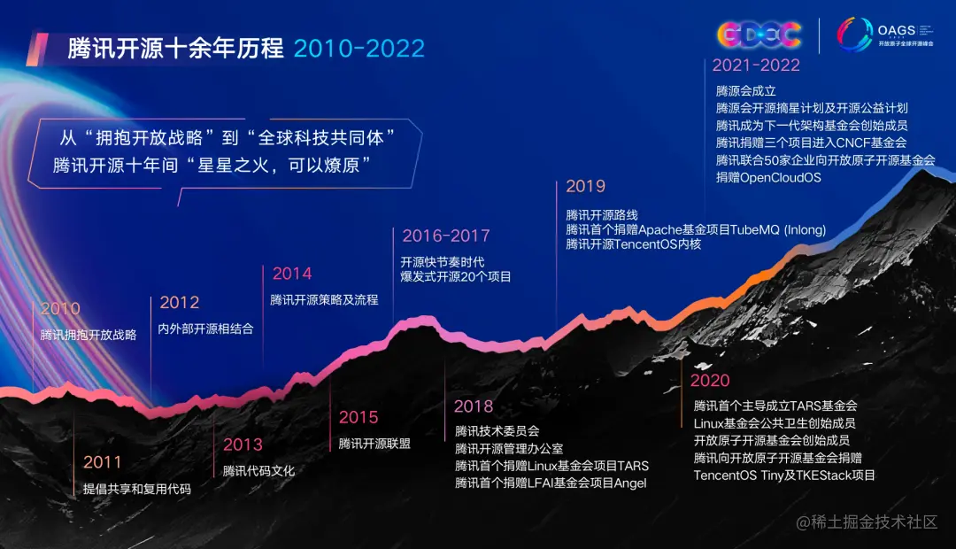自 2010 年以来,腾讯从集团层面全面拥抱开放战略,内部开始试水开源,好的项目会跨团队、跨部门、跨业务的广泛使用,由此积累了对外开源的基础。