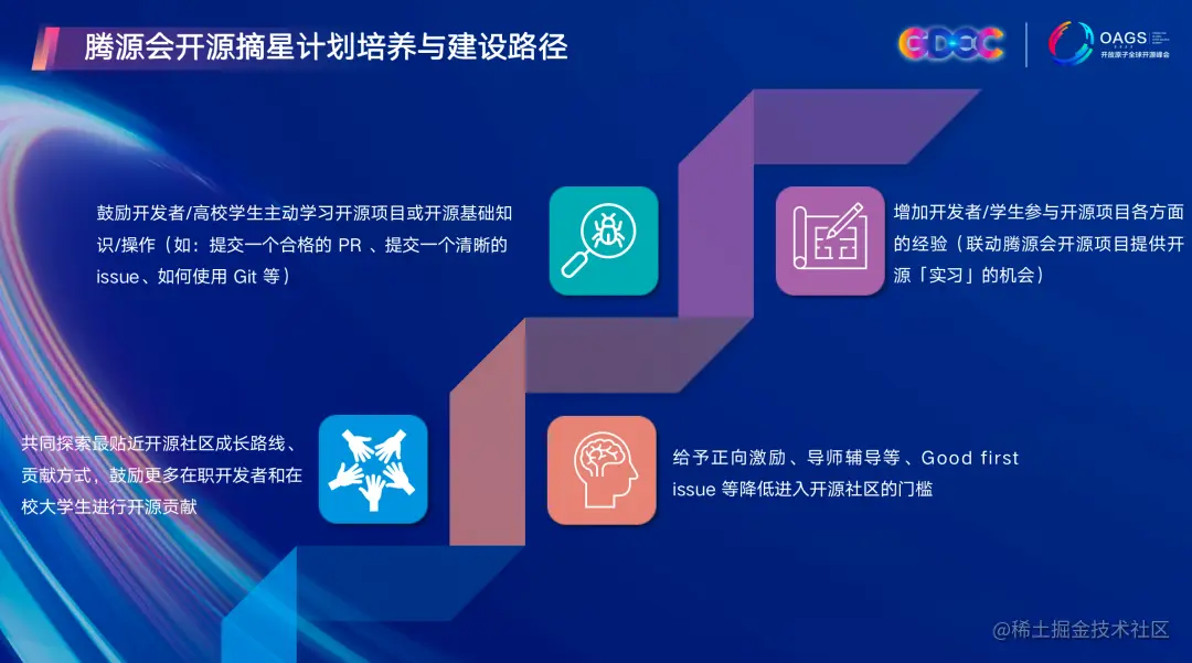 围绕「为开源人提供成长激励,为开源项目提供成长支持」的宗旨,开源摘星计划探索了多条适宜开源社区的成长路线和贡献方式,以及多重荣誉激励以及奖品,包括「开源摘星 100 人」的评选,年终前往腾讯总部的参访交流以及年终的开源盛典参与名额,可能后续还包括,优先享有培养助学金、商业路演等机会……通过一系列的、连续的激励手段,我们希望达成的目标是:充分鼓励更多开源爱好者能持续的参与贡献。