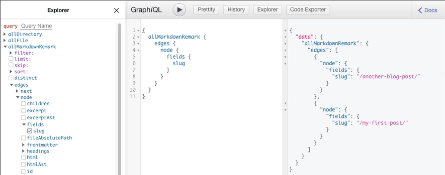 在这里,我们使用allMarkdownRemark 来查询所有的Markdown文件,这可以从我们安装的插件gatsby-transformer-remark 。