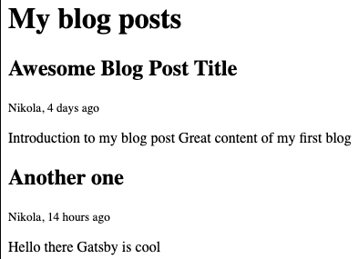 幸运的是,Gatsby会接收所有这些变化,并在/blog ,使一个新的页面可用。如果我们进入/blog ,我们应该看到像这样的东西: