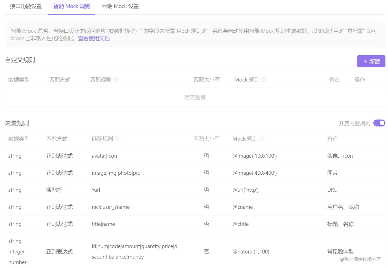 - 预先构造了一批常用数据的mock规则,作为内置智能mock引擎,不需要开发再编写脚本,就能mock出比较真实的业务数据。