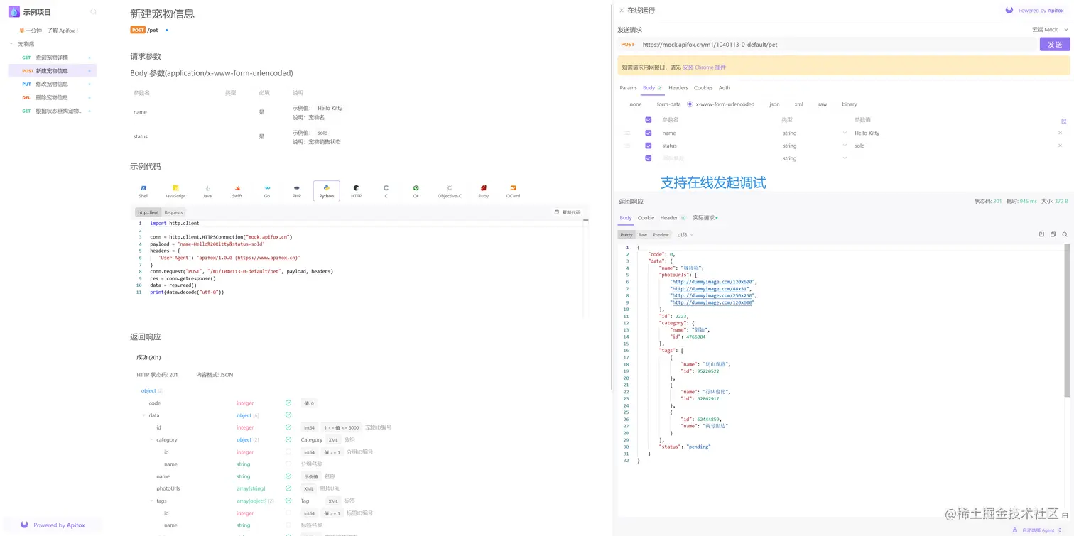 Apifox 的接口文档颜值,功能支持上会比 swagger ui 丰富得多。