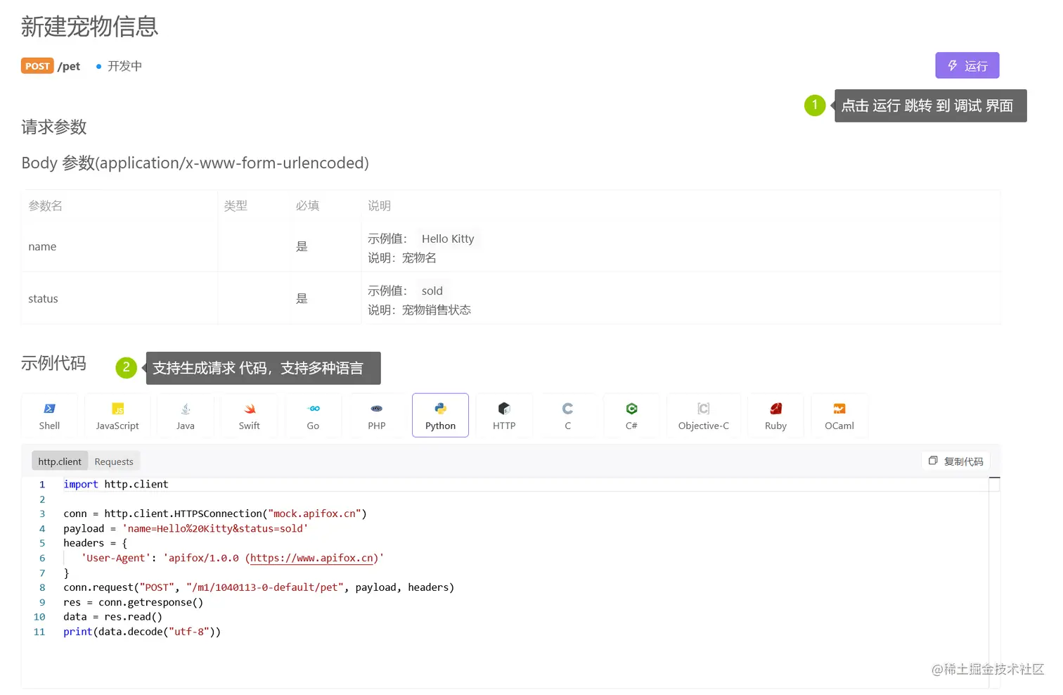 另外,在接口文档上也提供了额外的功能支持,可以生成接口的请求代码,也可以点击运行,对接口文档发起调试。