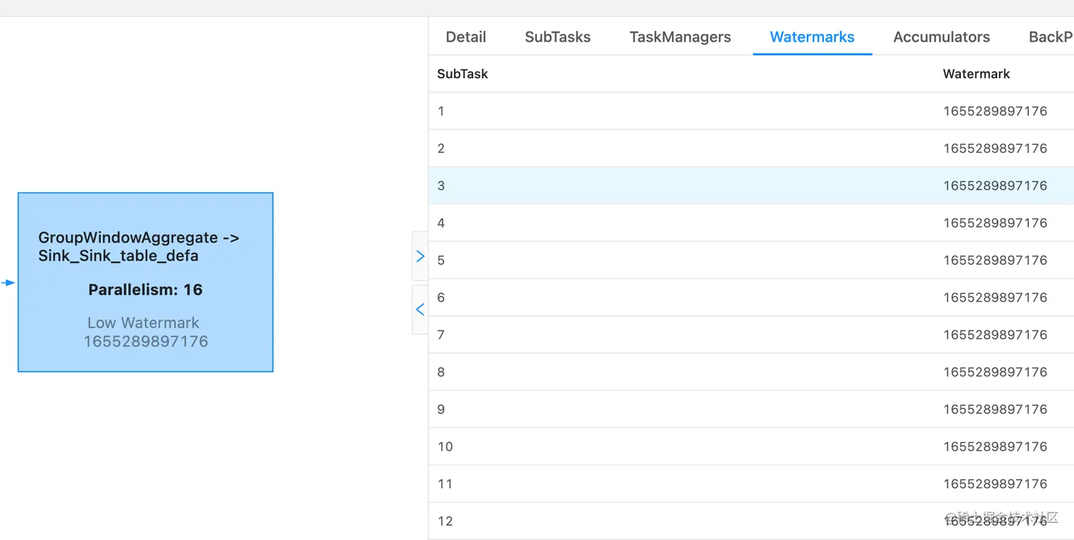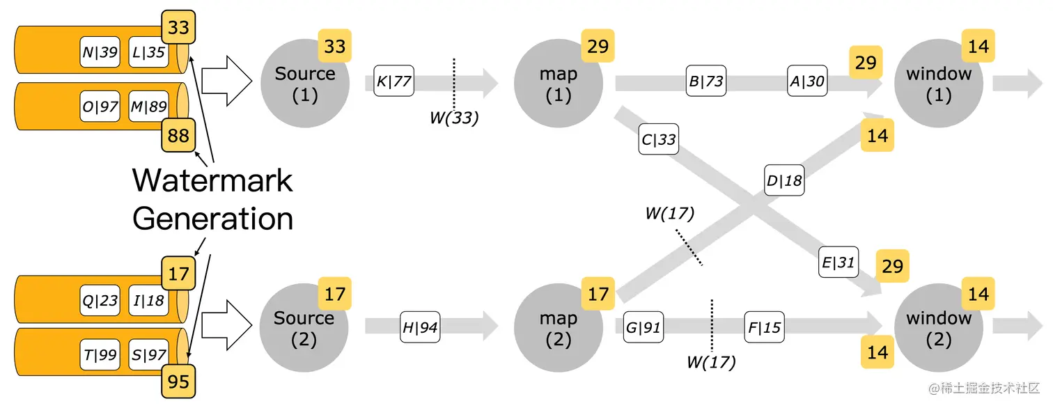 传递规则是:下游算子的watermark是上游算子中watermark最小的那一个。这种传递规则是很好理解的,因为watermark标志的是在此之前的数据已经完全到来,所以上游算子中最小的watermark代表着所有上游算子的共识,因为所有上游算子都认为在这个watermark之前的数据已经全部到来了。