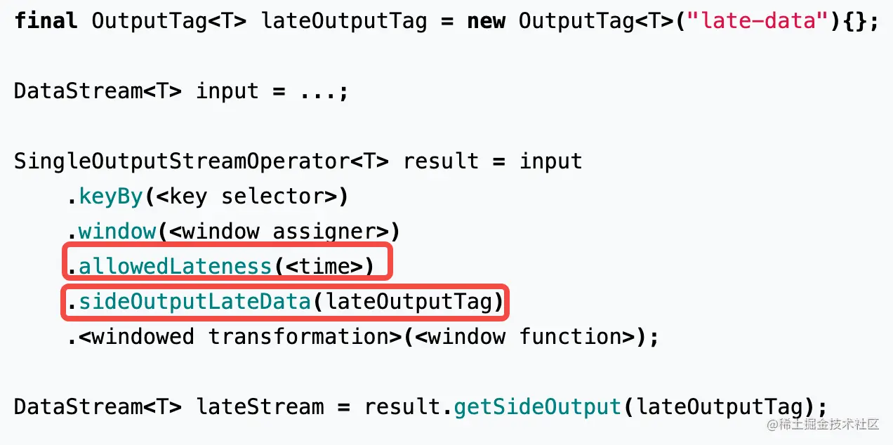 allowLateness这么长时间,在这段时间内如果还有数据到来,则继续之前的状态进行计算 (适用于SQL,DataStream) - SideOutput(侧输出流) 这种方式需要对迟到数据标记一个tag,然后在DataStream上根据这个tag获取到迟到数据流,然后业务层面自行选择进行处理。 (适用于DataStream)
