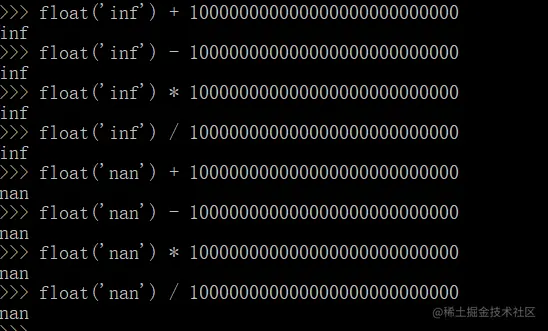 Python 中也有这两个数的存在,即 float('inf') 表示无穷大、float('nan') 表示非数。它们就像是两个黑洞,会吞噬掉任何试图前来“搭讪”的数:
