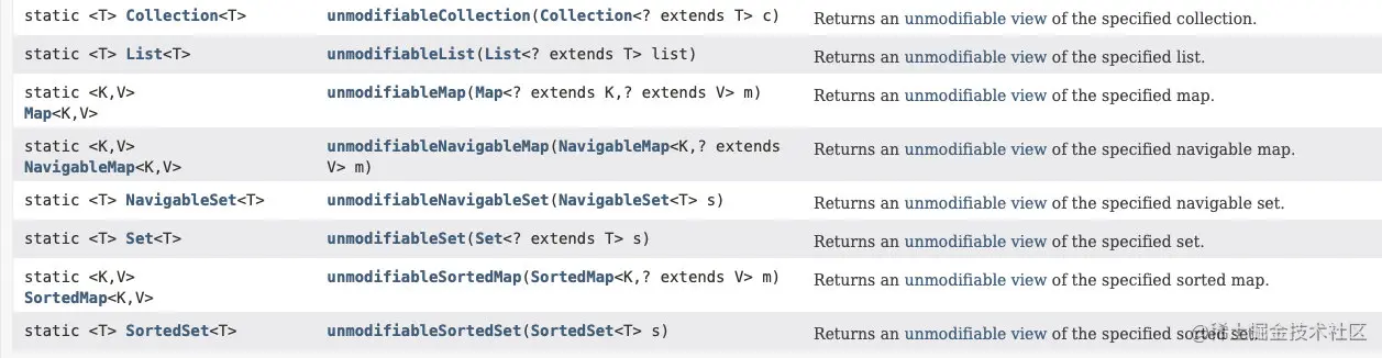 Collections.unmodifiableList 实现的不是真正的不可变集合,当原始集合修改后,不可变集合也发生变化。此外,它返回的数据结构本质仍旧是原来的集合类,所以它的操作开销,包括并发下修改检查,hash table 里的额外数据空间都和原来的集合是一样的。