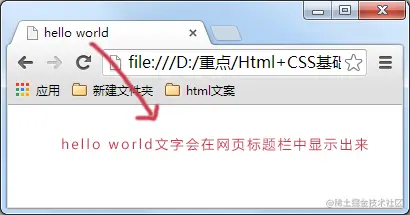 <title> 标签的内容 “hello world” 会在浏览器中的标题栏上显示出来,如下图所示: