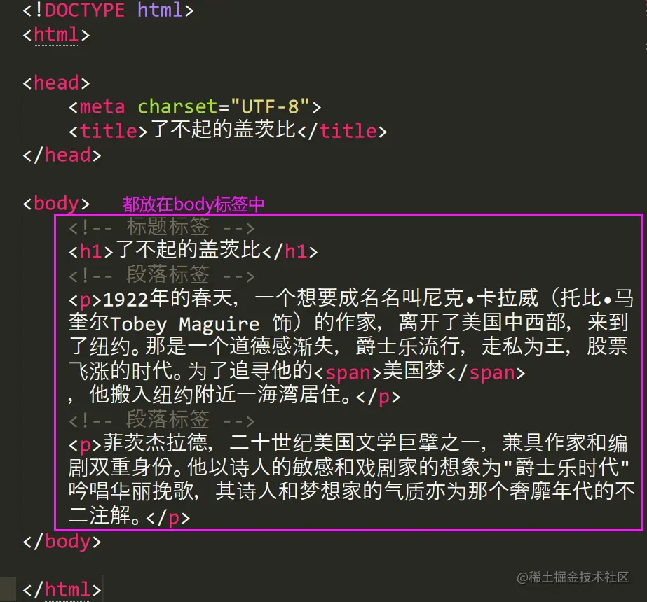 在网页上要展示出来的页面内容一定要放在body标签中。如下图的例子: