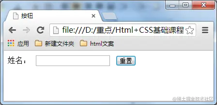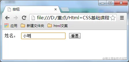 当用户需要重置表单信息到初始时的状态时,比如用户输入 “用户名” 后,发现书写有误,可以使用重置按钮使输入框恢复到初始状态。只需要把 type 设置为 "reset" 就可以。