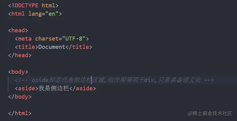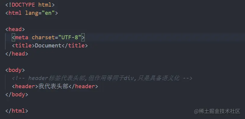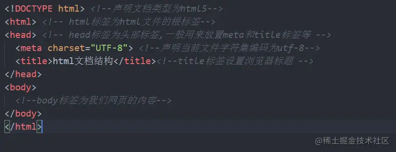 <!DOCTYPE html>:文档类型声明,表示该文件为 HTML5 文件。<!DOCTYPE>声明必须是 HTML 文档的第一行,位于<html>标签之前 -