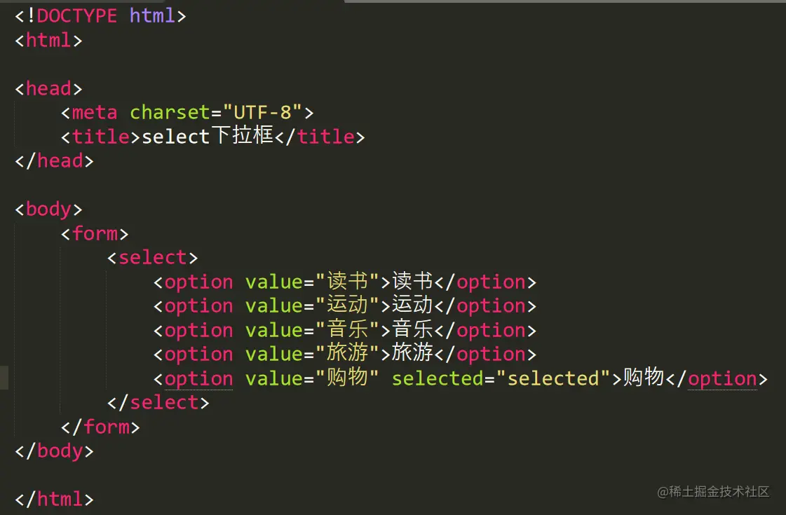 select 标签里面只能放 option 标签,表示下拉列表的选项。