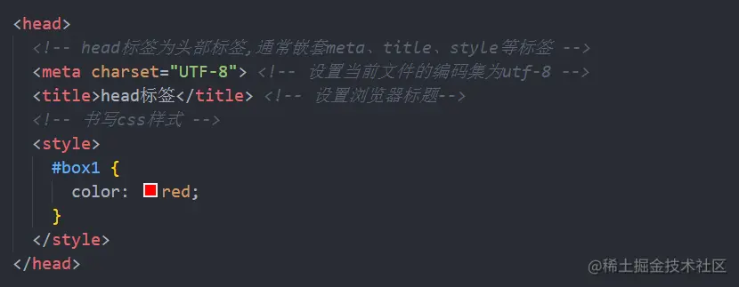 head标签表示头部标签,通常用来嵌套meta、title、style等标签。 -