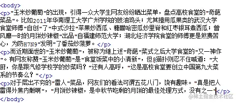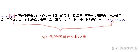 注意一段文字一个 <p> 标签,如在一篇新闻文章中有 3 段文字,就要把这 3 个段落分别放到 3 个 <p> 标签中。如下图所示