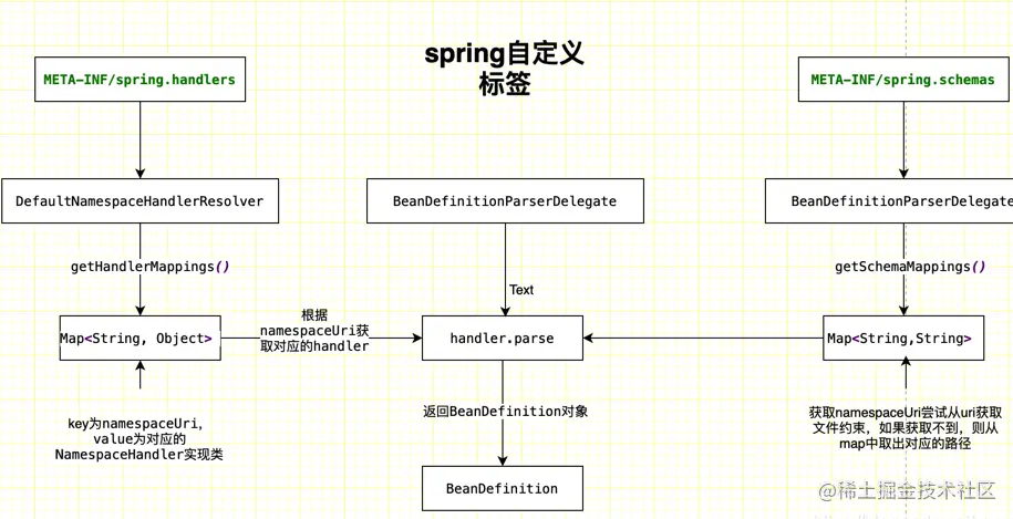 总结一下,加载自定义的配置标签,很重要的是两个文件,一个spring.handler 一个spring.schemas,用一张图表示