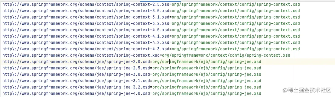 虽然通过配置文件头可以到对应的网站进行解析,如果网络不通的情况下该怎么办?那就要使用本地的解析。对应本地的解析文件就在spring.schemas文件中