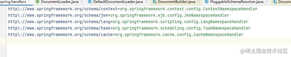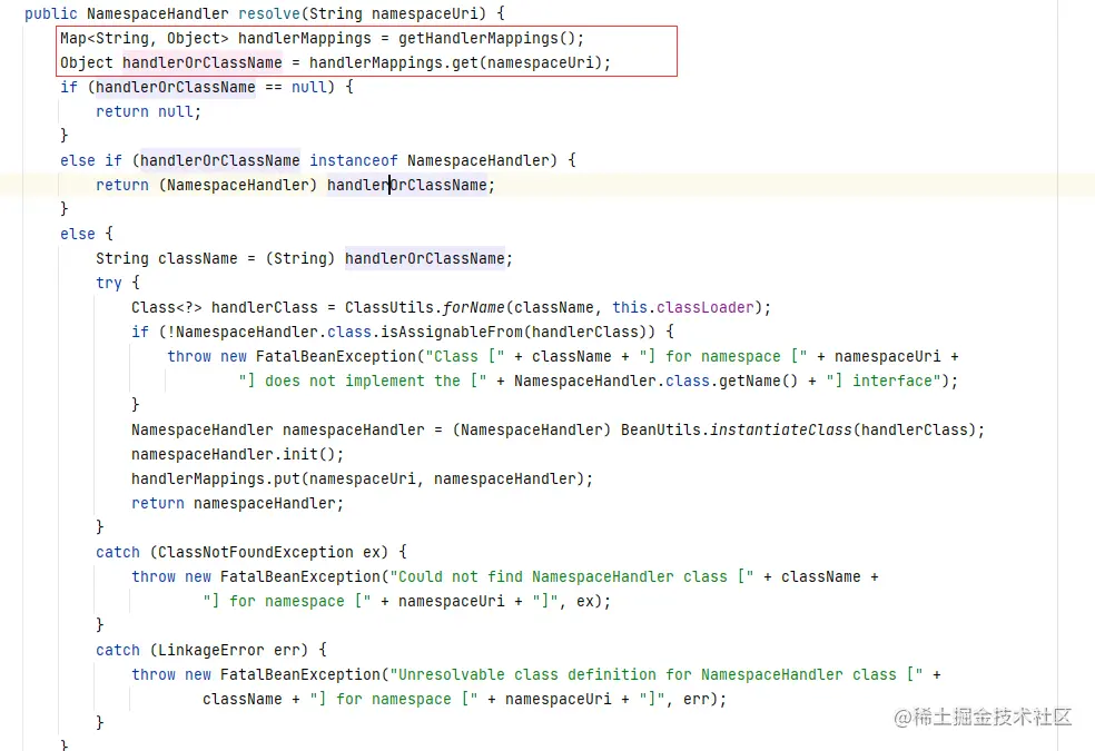 在resolve中包含一个方法叫做getHandlerMappings(),其实和加载spring.schemas的道理一样,回去把所有的META-INF下的spring.handler按照map的形式进行加载,然后根据namespaceUri获得具体的NamespaceHandler