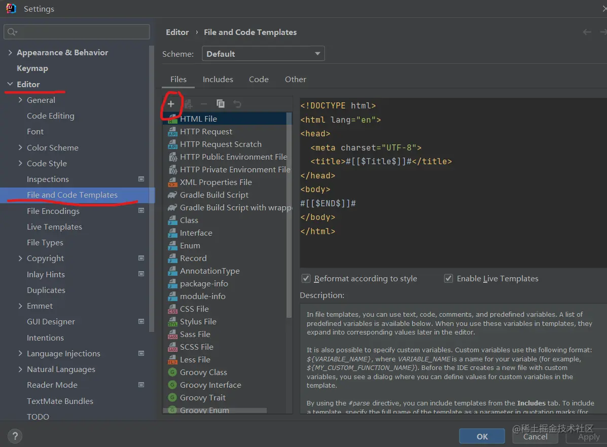 2.找到Editor下的File and Code Templates 点击右边的“+”