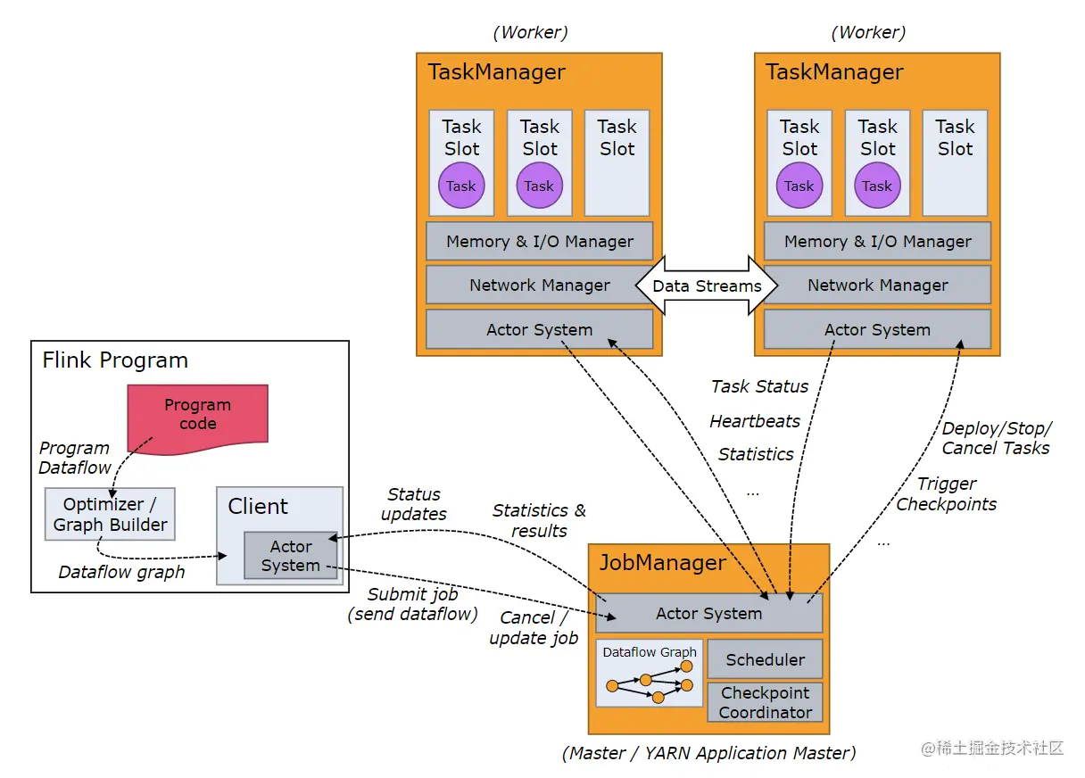 2.TaskManager(TM) :负责执行一个DataFlowGraph 的各个task 以及data streams的buffer 和数据交换。
