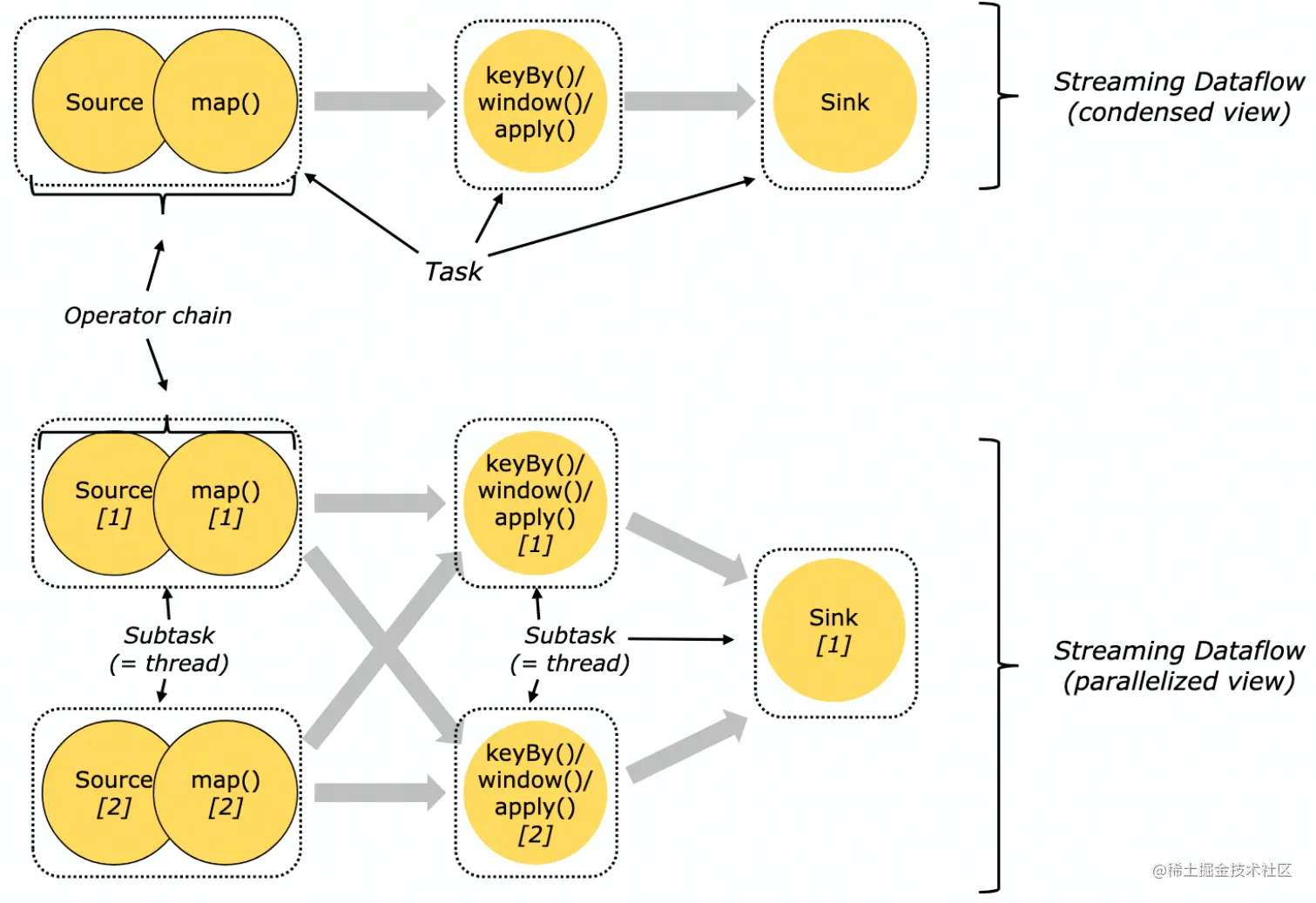 为了更高效地分布式执行,Flink 会尽可能地将不同的operator链接(chain)在一起形成Task。