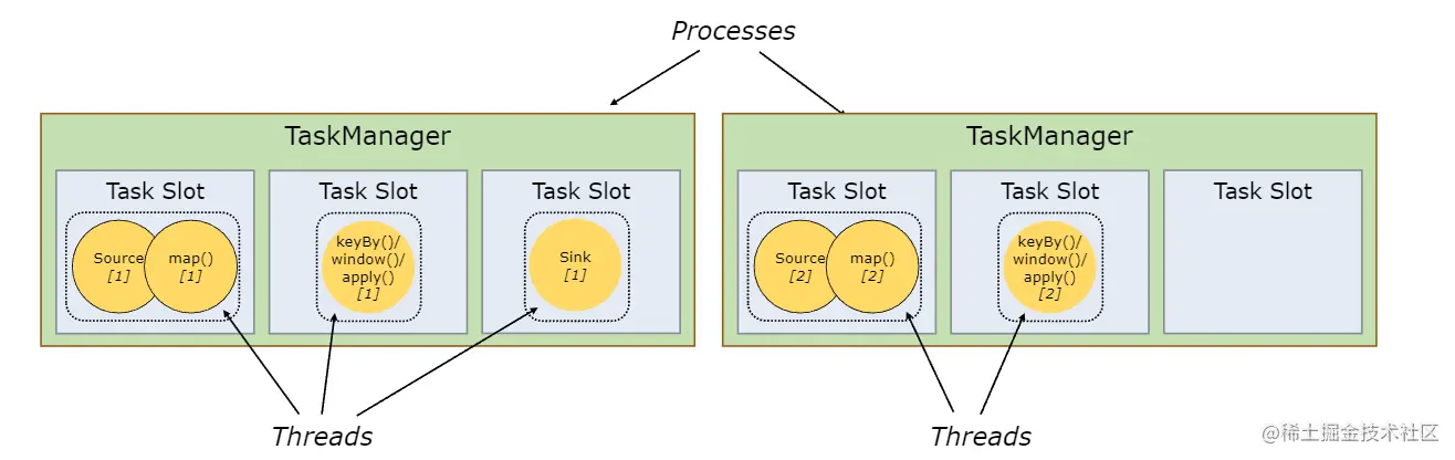这样每个Task可以在一个线程中执行,内部叫做OperatorChain,如下图的source 和map 算子可以 Chain在一起。